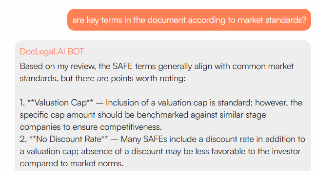 Instead of reading 20 pages, you can get a one-page summary highlighting the essential terms: parties, payment schedules, key deadlines, termination rights, and major obligations. DocLegal.ai has summarize-specific mode, further enhancing its capabilities and ensuring that its responses are precise and contextual. This can aid you to be more fully informed prior to making decisions based on the document.