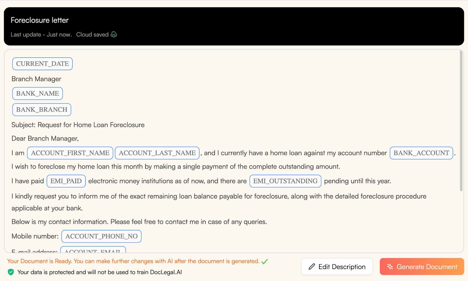 With DocLegal.Ai, you can describe your scenarios and the chatbot generates a draft that matches your requirements.