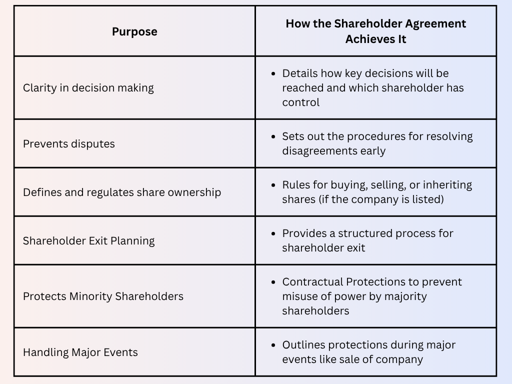 A shareholder agreement pre-emptively addresses key issues: share transfer, decision making deadlocks and shareholder exit process thereby ensuring all shareholders are legally aligned from the beginning.